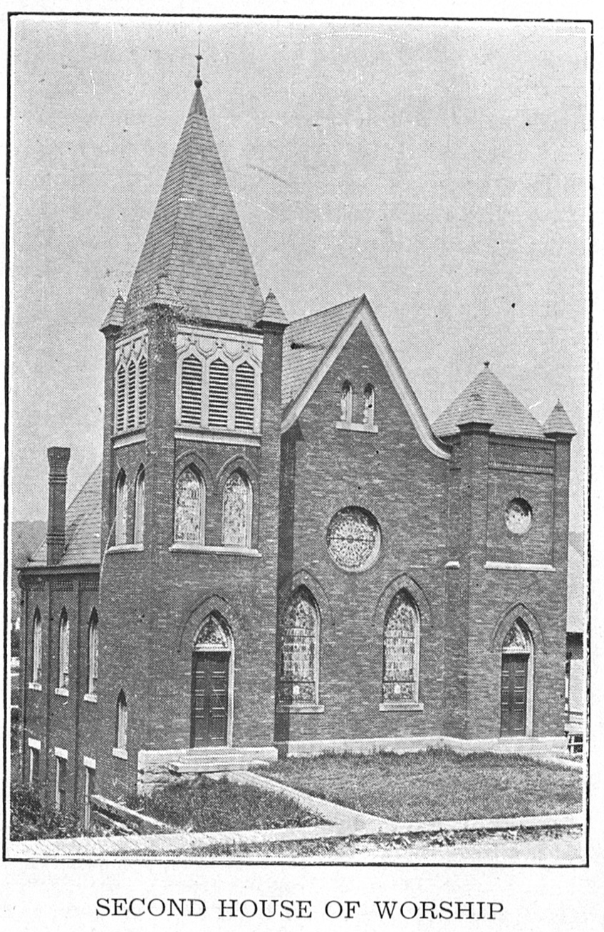 In erecting a second church a change of location was deemed advisable, and a site extending from State avenue to Fifth avenue, at the foot of School street, was chosen. A brick structure having a seating capacity of 300 was built for the approximate cost of $10,000. This building was dedicated in December, 1895, only about ten months after the burning of the first church.