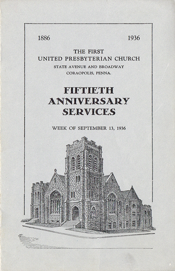 The organization of the First United Presbyterian Congregation of the Borough of Coraopolis, Pennsylvania, was begun on the evening of September 13, 1886, in the small wooden Methodist Episcopal Church at the corner of what is now Fifth and Main. A committee appointed by Monongahela Presbytery and consisting of the Rev. John D. Turner and Elders John Ewing and David Dines met with a few United Presbyterians and some friends to organize the congregation. After a sermon by Rev. Turner there were received into membership 19 persons. These elected Messrs. John M. Watt and Samuel Marshall to the office of Ruling Elder, and a Board of six Trustees was also elected. An adjournment until September 21st followed for completion of the organization, and the transaction of other essential business.